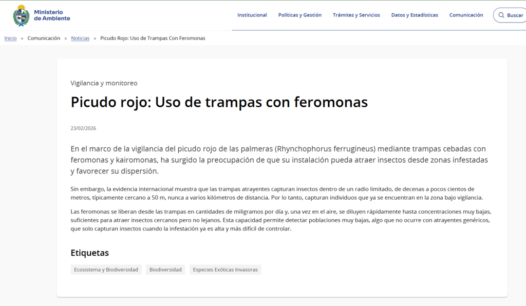 El Ministerio de Ambiente de Uruguay publicó recientemente un comunicado sobre el uso de trampas de feromonas para el control del picudo rojo: