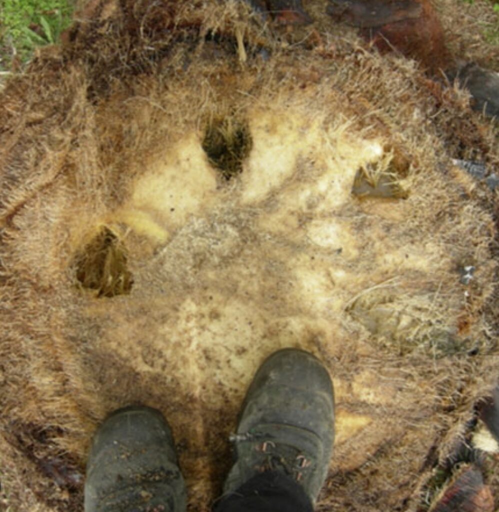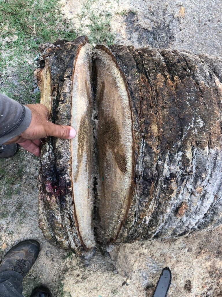 Tercero, la herida permanece abierta de por vida. Lo que con el tiempo se observa como cavidad o hundimiento en el estípite no es necrosis activa de defensa — como sí ocurriría en un árbol dicotiledóneo mediante el modelo CODIT. Es degradación pasiva de tejido permanentemente inerte: el tejido dañado se seca, colapsa y es degradado por microorganismos porque ningún proceso regenerativo lo reemplaza.