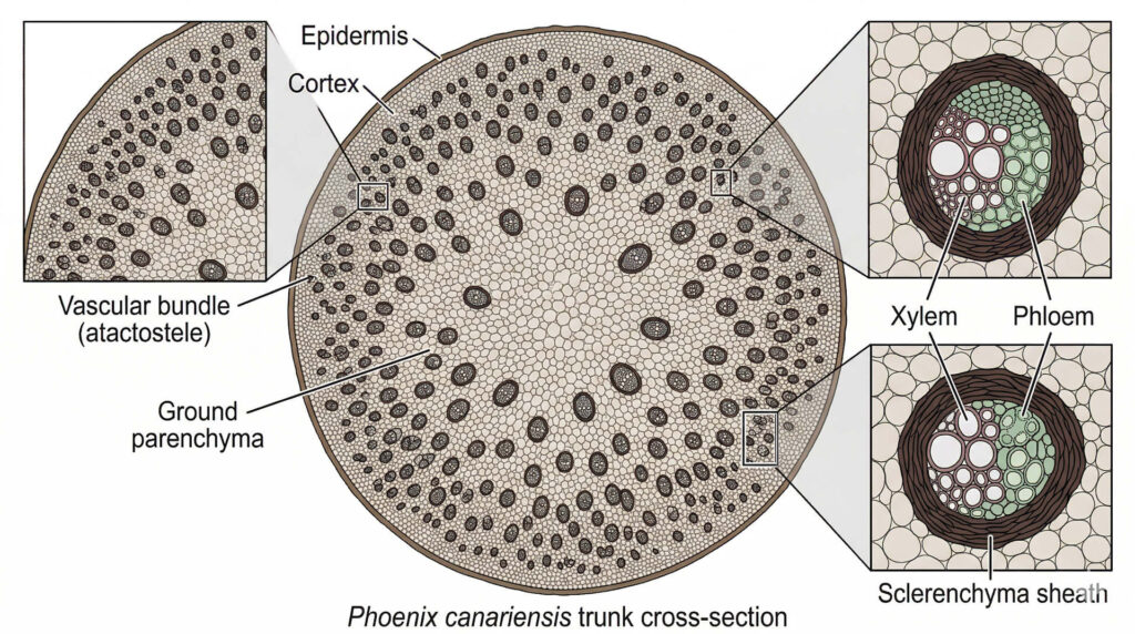 Las palmeras no tienen cámbium vascular. Sus haces vasculares (xilema y floema) están distribuidos en forma de fascículos dispersos a lo largo de todo el estípite, en lugar de concentrarse en una capa de cámbium como ocurre en los árboles dicotiledóneos. En la sección transversal del tallo se observan decenas o cientos de estos fascículos embebidos en una matriz de células parenquimáticas, con mayor concentración hacia la periferia que hacia el centro. Tomlinson (1990) en The Structural Biology of Palms -la referencia anatómica fundamental del grupo- y Broschat (2013) de la Universidad de Florida lo confirman con precisión: las heridas en el estípite que en árboles dicotiledóneos serían compartimentadas y cubiertas por tejido nuevo, en palmeras son permanentes (Broschat, 2013; DOI: 10.32473/edis-ep473-2013).