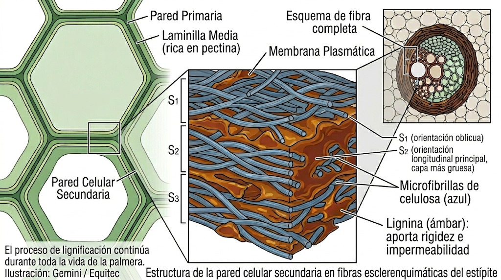 La respuesta es la lignina: un polímero fenólico que se deposita en las paredes celulares de las fibras esclerenquimáticas que rodean cada haz vascular. En los árboles, la lignina se concentra en la madera secundaria generada por el cámbium — tejido que muere al madurar y forma el esqueleto rígido del tronco. En las palmeras, en cambio, la lignificación ocurre dentro de los propios fascículos dispersos de xilema y floema, en las fibras que los envuelven, y continúa acumulándose durante toda la vida de la palmera, incluso en el tejido más antiguo (Rich, 1987; DOI: 10.1086/337626).